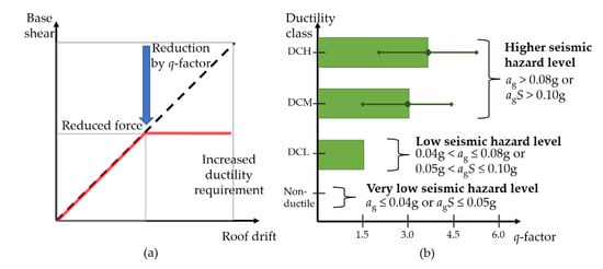 Figure 8a shows the concept of a force-based seismic design approach in which a behaviour factor (q-factor in EC8 []), or a similar set of factors, is introduced to lower the design strength of the seismic action whilst allowing the structure to experience post-elastic deformation in a ductile manner; the higher the level of ductility and/or overstrength, the higher the q-factor. Figure 8b shows the range of q-factor values recommended in EC8 according to ductility classes. Areas where the value of the design ground acceleration on rock (ag, being the product of agR with an importance factor, γI) is lower than 0.08 g, or where agS is lower than 0.10 g (where S is the soil factor), the condition of seismicity is classified as “low”. Structures located in these areas can be designed to Ductility Class Low (DCL) in alignment with design compliance with the respective material-specific design standard. For example, structures built of reinforced concrete (RC) are designed to requirements stipulated by Eurocode 2 (EC2) [], which is without any seismic detailing provisions. In areas where the hazard level is above the “low” threshold (including borderline cases, say ag is 0.09 g), designers are compelled to comply with ductile design and detailing practices consistent with requirements in areas of high seismicity. This approach to seismic design may seem logical to some. However, the authors experienced major issues when implementing it in Malaysia.