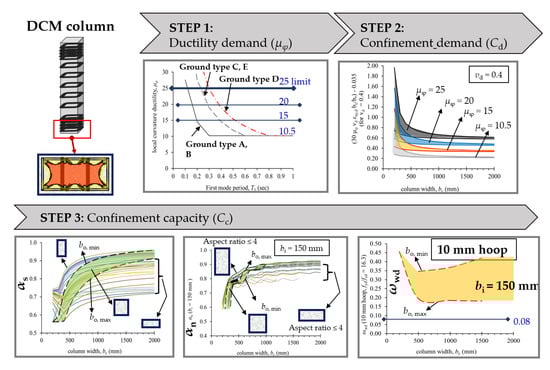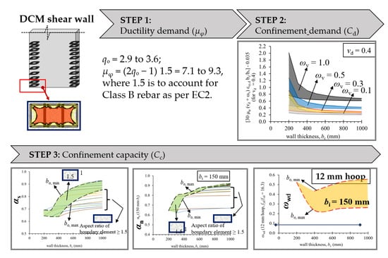 The published Malaysia NA to EC8 [] may result in many areas in the country being subjected to DCM design requirements. In anticipation of this challenge to engineering practice, the authors took the proactive initiative to assist practising engineers in coping with DCM design in RC buildings. Looi et al. [] summarised the steps and developed EC8 DCM tools for rectangular RC columns (see Figure 9 for a snapshot) and RC shear walls (see Figure 10 for a snapshot). Designing RC columns and shear walls to DCM requirements requires determining the ductility demand (Step 1) and the associated confinement requirements (Step 2), which are to be compared against the confinement capacity (Step 3).