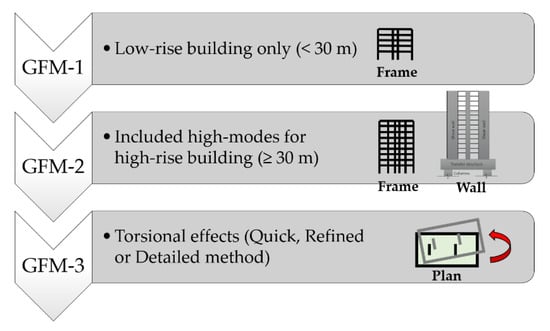 EC8 provides a code-based lateral force method to emulate seismic behaviour by applying equivalent static forces to the building. However, this code-stipulated simplified analysis method is subject to stringent pre-qualification criteria which are concerned with vertical and horizontal regularity. Most of the building stocks in Malaysia feature irregularities in planning, such as asymmetrically disposed structural walls around the building, resulting in a significant eccentricity of the centre of rigidity from the centre of mass of the building. This form of irregularities can be compound with other forms of irregularities such as setbacks, discontinued load paths and transfer structures. EC8 prohibits the use of the lateral force method on a building that possesses any of these irregularity features. EC8 stipulates three-dimensional (3D) dynamic analysis (or modal response spectrum analysis) as the default analysis procedure. Executing dynamic analysis in a controlled manner requires expertise and experience in structural dynamics, and such engineering skills can be scarce in a country where seismic design practice has yet to be established. This type of challenge in Malaysia is common to other countries of low-to-moderate seismicity. To circumvent the challenge, the authors have devised a simple and yet accurate method of structural analysis (referred herein as the Generalised Force Method, GFM) that can be applied to multi-story buildings featuring horizontal and vertical irregularities. A key feature of GFM is that it does not rely on any code-based empirical formula to predict the natural period of vibration of the structure. The GFM may be applied at three different levels depending on the building (see Figure 11): GFM-1 is suitable for use in the 2D analysis of low-rise buildings; GFM2 has been enhanced to handle taller buildings, as higher mode effects have been taken into account (whilst generalised mode shapes and default modal period ratios are made use of to eliminate the need of modal analysis); and GFM3, which is structured into three tiers (Quick, Refined or Detailed methods), has been enhanced further to handle 3D phenomena []. Interested readers are recommended to read into recent publications presenting the GFM [,,].