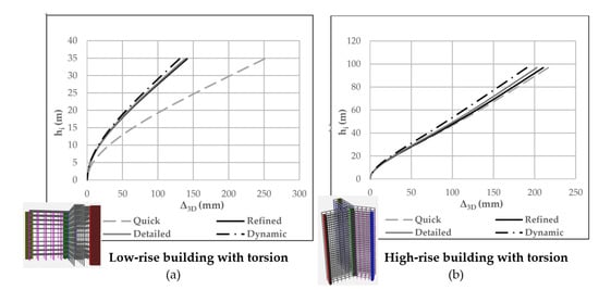Validated examples of displacement profiles using the GFM methods: (a) asymmetrical low-rise building (b) asymmetrical high-rise building.