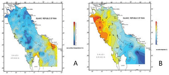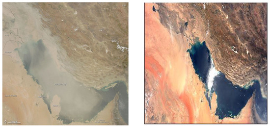 Studies show that most of the days of dust during these two years start from late March and continue until early August. To compare the distribution of surface exposure lines in the studied area during normal days and when the dust existed, Figure 13 was plotted by Surfer software. The flow lines of the water temperature on 9 August 2008 showed that dust was not scattered in the sky (Figure 13A,a). The flow lines of the water temperature on 9 August 2009 show that horizontal vision is about 500–300 m (Figure 13B,b). The investigation of these two forms together shows that when dust is at a maximum in the sky, the surface temperature of the water has lower values.