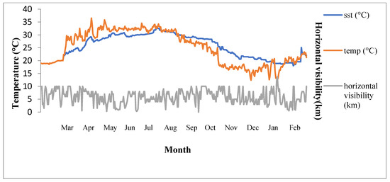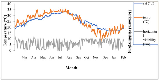 Time series of sea surface temperature, air temperature and horizontal vision in 2008 (sst: Sea surface temperature, temp: Air temperature).