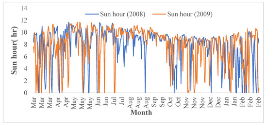 Time series of sunny hours in 2008 and 2009.