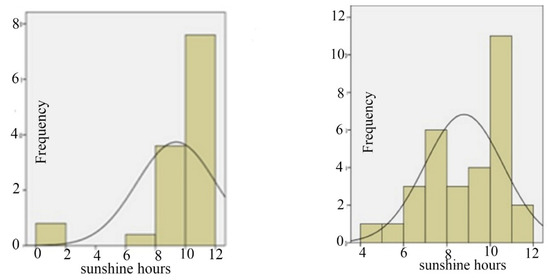 Sunshine hours’ distributions in August 2008 (Left) and 2009 (Right).