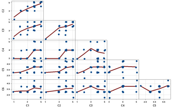 The matrix of correlation coefficients between the answers given by each scholar to each of the questions was also calculated (Table 6) (Figure 2). In this way, the reader can see how there is a slight correlation between C1 and C2; between C1 and C3; and between C1 and C2 and C3. Answers to questions C4, C5, and C6 generally maintain a low correlation with questions C1, C2, and C3.