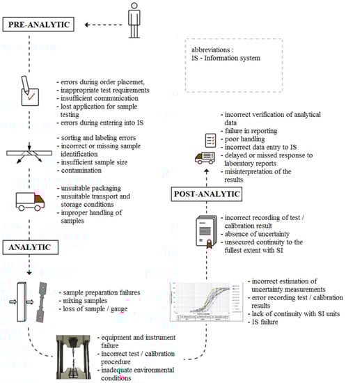 Errors can occur in any phase of the laboratory testing process. The phases are as follows: pre-analytic, analytic, and post-analytic phases (Figure 3). It is necessary to identify in which phase errors occur. Each phase of the laboratory process is affected by different risks. The risk relates to the unknown outcomes of the future event with the assumption that these outcomes will be undesirable. The prerequisite of a safe and competent laboratory is its management by managers who can apply the theory of risk and reduce it to an acceptable level [17,18].