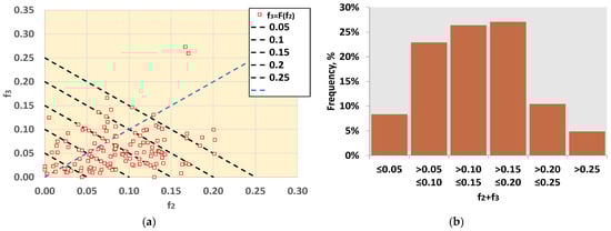 Figure 3 illustrates the fractions f2, f3, and the sum f2 + f3 of the surfaces of contaminating populations. In 73.6% of cases, the points are down the diagonal, meaning that f2 ≥ f3. Thus, in most data, the fraction of the second population with |n2| ≤ |n3| is considerably higher than that of the third. Figure 3b indicates that the fraction f2 + f3 ≤ 20 represents 84.7% of the total population of contaminating distributions. Additionally, 76.4% of the results lie between 0.05 and 0.20, constituting the main fraction of the two secondary distributions.