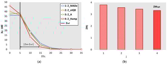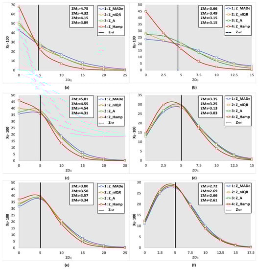 Equation (4) defines the variables shown in Figure 8. The shape of the distribution of outliers strongly depends on the number of participants, the model parameters expressing the distribution of the results, and the performance statistic selected. All curves have a long right tail, but its thickness in each distribution depends on the performance estimator. In general, Z_Hamp shows thinner tails, thus a lower percentage of outliers significantly higher than the reference value, Zref. Figure 8 shows the mean distances ZM between each performance estimator and Zref. Z_Hamp is the most effective estimator for the examples presented. An intriguing case appears in Figure 8b: Z_Hamp and Z_A estimators are both optimal, despite their distinct distributions. It results from using the objective criterion of the mean distance of the distribution from Zref, which is particularly effective for strongly non-normal distributions.