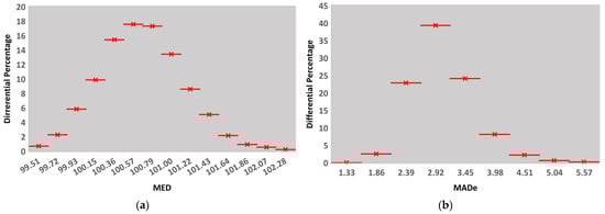 It is well known from very early research [] that the nonparametric skewness always lies between −1 and +1. For symmetric distributions its value is zero. It is positive for right skewed distributions (μ > ν) and negative for left skewed distributions (μ < ν). For each robust statistic, the algorithm computes the mean value, μ, by summing the products of each differential fraction fi, for I = 1 to Nb, with the average Xi of each interval of the histogram X-axis using Equation (6). The calculation of median value, ν, utilized linear interpolation between the points Xp, Xp+1, where fp < = 0.5 and fp+1 > = 0.5. Finally, Equation (7) provides the estimation E(|X−ν|).