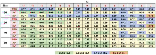 Figure 6 and Figure 7 present the SK values for various simulations: Nlab = 10, 20, 40, 80; s1 = 2; n3 = 7; n2 = −7 to +7; s2 = 1; s3 = 1; fr2 = 0.1; fr3 = 0.05; from which one can conclude the following:
