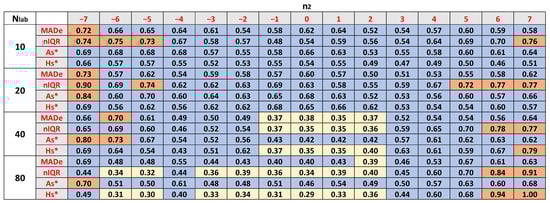 - In some cases, there are expanded zones where one estimator outperforms the others, increasing the robustness of the suggested solution. For example, in Figure 10 and Figure A3, for 5 ≤ n2 ≤ 6, the first choice is the Z_MADe. In Figure 10, Figure 11, Figure A3 and Figure A4, for −2 ≤ n2 ≤ 2 and f3 = 0.10 the correct selection is Z_A.