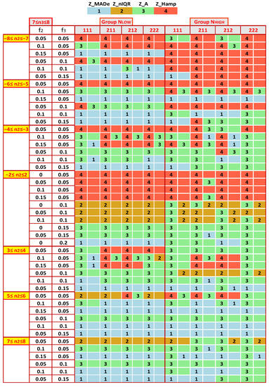 Figure A1 and Figure A2 show the best estimators in detecting outliers for [s1, s2, s3] = 222. The algorithm also calculates the sum per estimator and n3 value. If a cell contains multiple findings, the color is that of the estimator of the highest ranking in the row.