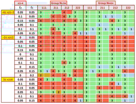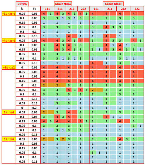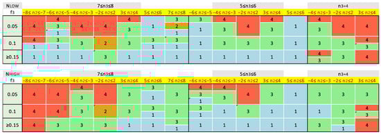 The simulator calculates the results for all combinations [s1, s2, s3] X [fr2, fr3], resulting in 120 matrices similar to those in Figure A1 and Figure A2, which are the exact solution of the optimization problem applying the criterion of Equation (4). Instead of this solution, we chose a functional sub-optimal one by grouping and classifying the parameters as follows:
