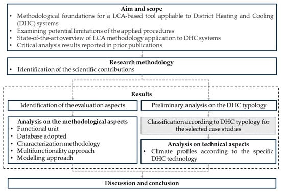 To the best of the authors’ knowledge, the recent scientific literature has not extensively addressed the evaluation of DHC networks through LCA analysis. Previous studies have not comprehensively covered all potential application scenarios, thereby hindering the attainment of a uniform and universally applicable assessment of the obtained results. Consequently, the authors proposed a literature review with the following objectives: (i) providing a state-of-the-art overview of the application of LCA methodology to DHC systems; (ii) critically analyzing the results reported in prior publications; (iii) examining potential limitations of the applied procedures; and (iv) establishing methodological foundations for developing a potential LCA analysis tool exclusively dedicated to DHC systems. The literature review comprises two main parts: identifying and analyzing publications with similar objectives to assess their scope of application and potential integration and focusing on case studies within the domain.