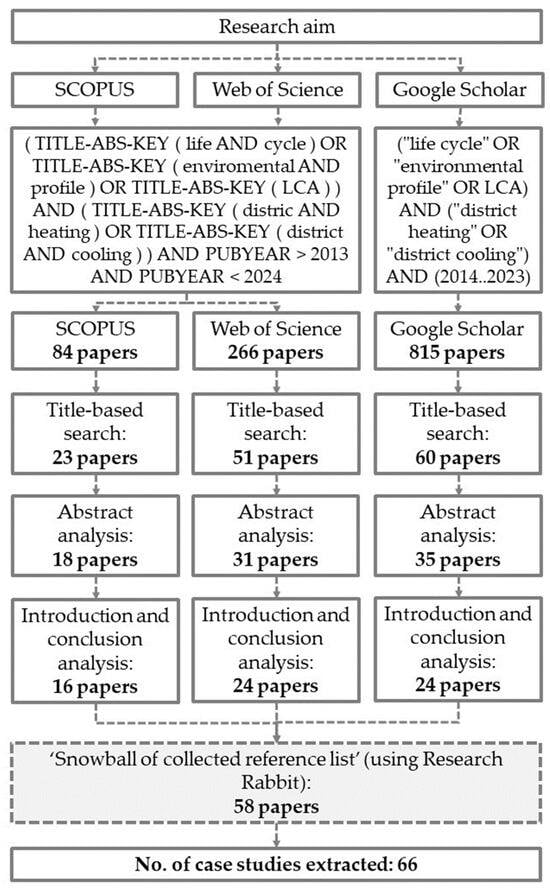 In the initial stage, all the literature reviews were meticulously selected with the aim of furnishing an exhaustive overview of the state-of-the-art methodology concerning LCA as applied to DHC. After the initial literature search, the papers were first filtered based on an analysis of the title and the abstracts and subsequently based on an analysis of the introductions and conclusions. Additionally, the literature was filtered to meet specific criteria. The filtering process was performed conservatively, retaining papers where there was uncertainty regarding whether they met the criteria. The selected papers had to meet specific requirements. Firstly, they needed to exclusively pertain to analyses conducted using the LCA methodology or reference results reconstructed using the same methodology for applications to environmental profile assessment. Consequently, all papers that, while addressing environmental assessment, provided results only on the use phase were excluded. Secondly, the authors prioritized publications that specifically referred to analyses of district heating or cooling networks or alternatively that were related to district analyses that included data derived from this technology. The search operations described above were conducted independently on multiple search engines, resulting in the creation of three distinct databases of potential publications. In the subsequent phase, these databases were merged, and the “snowball approach” was applied. This process aimed to achieve two primary objectives, the first of which was to eliminate duplicates that inevitably arose during the searches across the three search engines. Additionally, for each identified paper, the bibliography was analyzed using Research Rabbit. However, the impact of these supplementary sources was limited, as the publications relevant to the purpose of this research had already been provided by Scopus. Research Rabbit, however, facilitated the reconstruction of a network of related works by leveraging bibliographic references from scholarly contributions. While the contribution of these additional databases was acknowledged, the authors had already planned to identify potential case studies within the Scopus-provided literature. Consequently, the integration primarily served to validate the selected articles.
