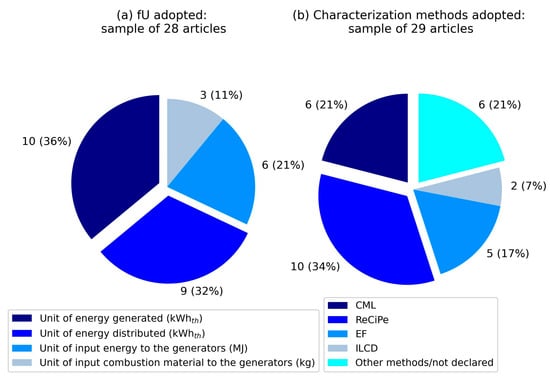 The results reported by the scientific contributions were reconstructed based on a diverse selection of characterization methods, summarizing an analysis of the methodologies used and declared by the various scientific contributions. From the analysis, ReCiPe emerges as the most widely used family of methods [26]. None of the authors provide reasons for opting for one methodology over another, but the choice of ReCiPe could be attributed to its ability to provide comprehensive information and a balanced approach between detail and synthesis, even at a global scale, thanks to the proposed indicators. The family of characterization methods developed by the CML program is generally chosen for academic purposes and applications related to industrial research and development [27].