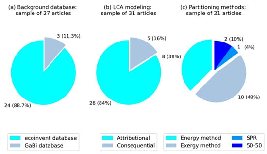 Summary of results on the methodological aspects: (a) background database; (b) LCA approach adopted; (c) multifunctionality approach adopted.