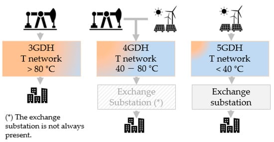 The classification of the case studies was informed by the typologies of the network generation, articulated as discussed before. The authors did not explicitly stipulate such categorization, which constituted the prevailing scenario. The determination pivoted on discerning factors such as the temperature differentials of the heat transfer fluid. In cases where these data were unavailable, an internal assessment was undertaken, factoring in integrating renewable energy sources (RESs) within the generation framework. This classification parameter remains fundamentally qualitative and is the least straightforward, as the literature lacks sufficiently validated and robust data and conditions to support its reconstruction. Additionally, reconstructing it from inventory data provided by DHCN operators would not be straightforward either, as these operators have integrated various alternative solutions to fossil fuels over time. Consequently, such integration could result in a classification parameter that does not correspond to the actual state of affairs. As observed, the threshold temperature for classification varies depending on the considerations put forth by the authors. The classification threshold between 4GDH and 5GDH was established at approximately 40 °C, considering the average value derived from the contributions of the two aforementioned authors. As for the threshold temperature between 3GDH and 4GDH, a value of 80 °C was determined based on the scientific literature. Figure 5 is a summary scheme of the parameters and the descriptions reported in this subsection.