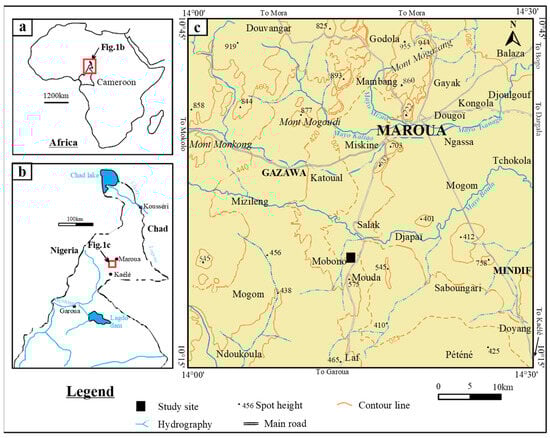 (a) Location of Cameroon in Africa, (b) study area in North Cameroon, (c) study area detail topographic map.