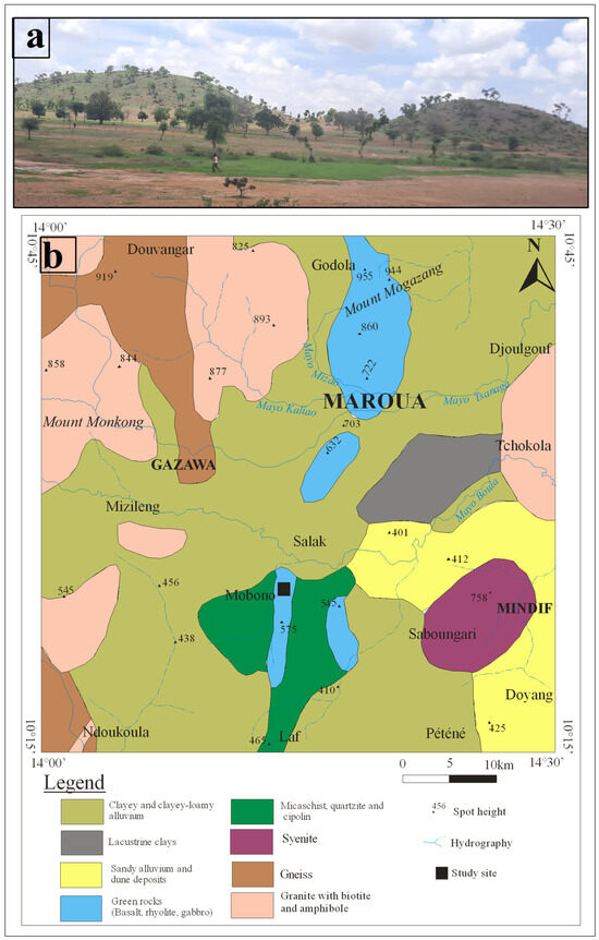 (a) Landscape photograph showing hill units associated to plain in Mobono, North Cameroon; (b) Geological map of the studied area with the indication of Mobono (Extracted from the compilation of the Department of Mines and Geology of Cameroon in 1979 modified by Brabant and Gavaud [39]).