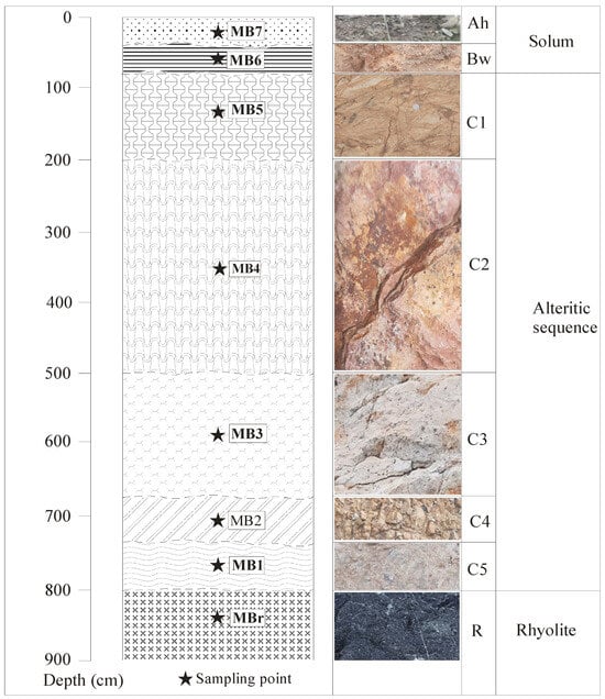 From the bedrock (MBr) to the soil surface, horizons are merged into two sequences, i.e., an alteritic sequence and a solum (Figure 3). Soil description was made on trench walls opened for the exploitation of the quarry for aggregates production, and colours were determined in the field in their dry state using the Munsell colour chart.