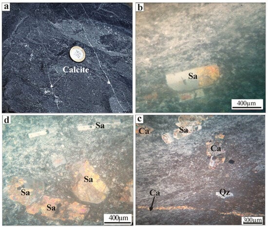 Macroscopic (a) and analyzed polarized light microscopic view (b–d) of the Mobono rhyolite (MBr). Sa: sanidine; Qz: quartz; Ca: calcite.