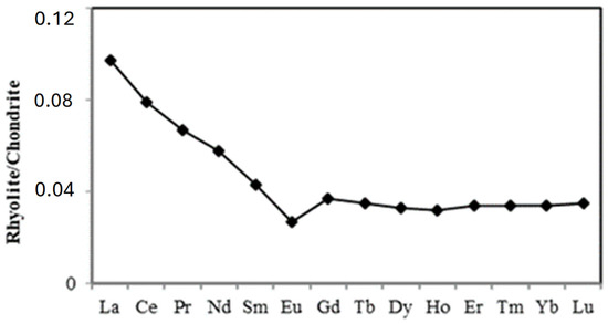 Chemical analysis of the rhyolite revealed that SiO2 (70.59%) and Al2O3 (13.73%) are the main elements. These elements were followed by Na2O (5.89%), Fe2O3 (4.12%), CaO (1.74%) and K2O (1.55%). Other element contents were below 0.4% (Table 2). Main trace elements were Ba (611 mg kg−1), Zr (259.30 mg kg−1), Sr (147.60 mg kg−1), Y (48 mg kg−1), Ga (17 mg kg−1), Rb (14.90 mg kg−1). The remaining trace elements had contents below 10 mg kg−1 or were below the detection limit (Table 2). The sum of REE reached 143.06 mg kg−1 in the rhyolite, dominated by LREE (112.13 mg kg−1, LREE/HREE = 3.63). The (La/Yb)N ratio was low (2.86) (Table 2). The chondrite–normalized REE pattern (Figure 5) showed a negative Eu anomaly in the rock (Eu/Eu* = 0.67) but no Ce anomaly (Ce/Ce* = 0.98).