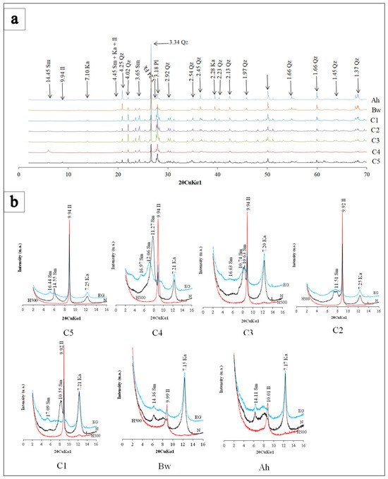 In the alteritic sequence, diffractograms (Figure 6a,b) show that the soil mineralogy consists of primary minerals (quartz, K-feldspar, plagioclase) and secondary minerals (kaolinite, smectite, illite). Furthermore, a 7Å peak was seen in some diffractograms after heating at 500 °C, characteristic of interstratified minerals of 1:1/2:1 type [51]. Depending on the horizon, certain minerals appeared or disappeared. The C5 and C4 horizons were composed of quartz, K-feldspar, plagioclase, smectite, kaolinite and illite (Figure 6a). The C1, C2 and C3 horizons displayed the same mineralogical composition compared to the underlying horizons. In the C3 horizon the characteristic peak of smectite at 16 Å after ethylene glycol solvatation (EG) was not well developed (Figure 6b). In the C2 horizon, the smectite peak was expressed by a slight shoulder around 18Å on the EG spectra. On the bulk powder spectrum of C1 horizon sample, no clay minerals were identified; they were only observed after heating and saturation with ethylene glycol (Figure 6a,b). The mineralogical assemblage of the solum (i.e., Bw and Ah horizons) is similar to that observed in the alteritic sequence (Figure 6a,b).