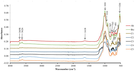 The infrared spectrum confirms the presence of quartz and aluminium phyllosilicates shown by the Si-O vibration bands between 900–1200 cm−1 or 750–800 cm−1 and the Al-O band between 400–700 cm−1 (Figure 7). Quartz is identified by peaks at 999 cm−1 and 787 cm−1. Kaolinite is identified by the three peaks at 3698 cm−1, 3626 cm−1 and 910 cm−1. Smectite was also identified by the 1618 cm−1 peak. In addition to the minerals identified by X-ray diffraction, the presence of calcite (723 cm−1), lepidocrocite (743 cm−1) and goethite (640 cm−1) was noted. Except goethite that is observed in all samples, the infrared spectrum show some variations in the mineral content of the samples. In the C5 horizon, calcite (723 cm−1) and lepidocrocite (743 cm−1) are present. Calcite is absent in the C4 horizon. Lepidocrocite is only present in the C1 horizon. In the Bh horizon, sepiolite is present, a mineral characteristic of dry environments, identified here by the peak at 530 cm−1. The Ah horizon has an IR spectrum similar to that of the Bw horizon (Figure 7). However, the vibration band of the C-H bonds between 2700–2900 cm−1 characteristic of aliphatic compounds of organic matter is absent. This is in agreement with the very low abundance of organic matter in this semi-arid environment.
