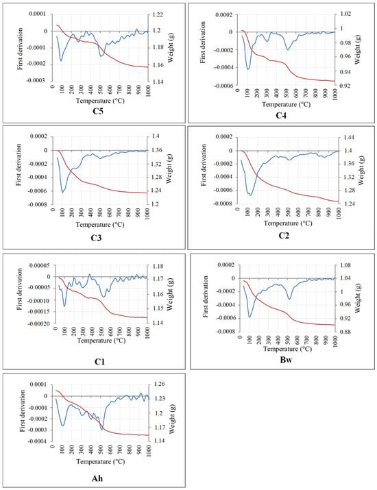 The thermal behaviour of studied soil is similar from one horizon to the other but with variable weight loss (Figure 8). An endothermic peak between 50–125 °C or 40–150 °C indicates the disappearance of surface water or intra-layer water from clay minerals [52]. An exothermic peak is observed between 175 and 250 °C. The high peak intensity indicates the presence of a swelling (smectite) and a non-swelling phase (illite), characteristic of interstratified minerals [53]. An intense endothermic peak is also observed between 450 and 550 °C, accompanied by a weight loss ranging from 2 to 5%. This weight loss was associated with dehydroxylation according to the reaction 2 (OH)→H2O + Or (r, residual) [54,55]. The peak is characteristic of the loss of hydroxyl groups from clay structures indicating the presence of kaolinite [56]. The bulging in the range 300–450 °C marks the presence of a swelling phase (smectite) with a non-swelling phase (illite) characteristic of an interlayer mineral. For the Ah horizon, there is about 4% weight loss. An exothermic peak between 250–475 °C corresponds to the dehydroxylation or dehydration of illite-smectite interstratified minerals. The weight loss recorded between 600 °C and 900 °C reflects the presence of 2:1 clay minerals which lose their constitution water between this temperature interval. In all TGA curves, the weight loss observed between 275 °C and 300 °C could reflect the presence of iron oxyhydroxides (goethite) in the studied soil horizons.