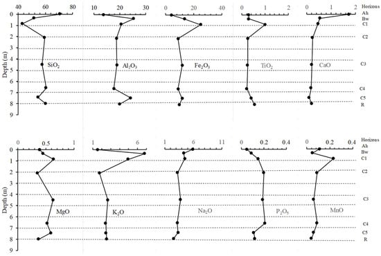 SiO2 and Al2O3 display an opposite variation in concentrations along the depth profile (Figure 9). MgO concentrations also present an opposite evolution with respect to SiO2. The concentrations of Al2O3, Fe2O3, TiO2 and K2O have a similar variation trend with depth. CaO, Na2O and MnO concentrations significantly decrease with increasing depth except in the C1 horizon marked by an increase in MnO concentration (Figure 9).