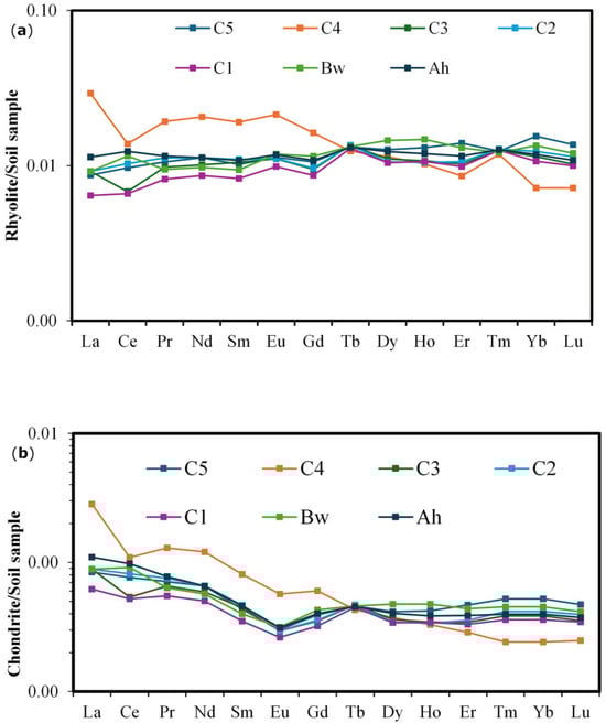 (a) Rhyolite-normalized rare-earth element patterns for soil samples; (b) Chondrite-normalized Rare-Earth Element patterns for soil samples. Chondrite normalizing values after McDonough and Sun [51]. MB1: C5; MB2: C4; MB3: C3; MB4: C2; MB5: C1; MB6: Bw; MB7: Ah.