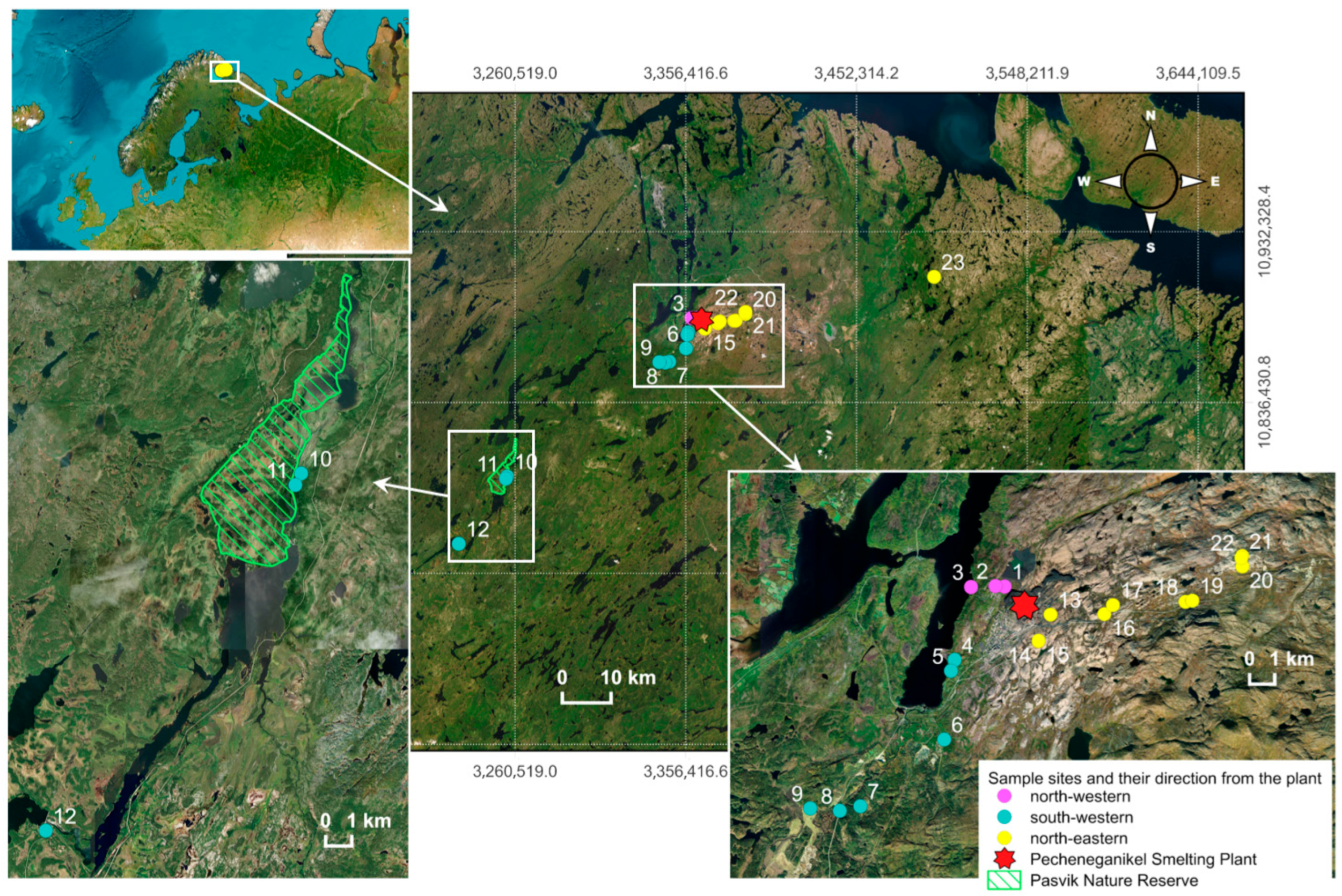 The analysis of soil mineral content in the vicinity of industrial plants is of fundamental importance for the assessment of ecological risks and efficient phytoremediation technology development [1]. The Nikel settlement in the Murmansk region, situated in the vicinity of the Norwegian and Finnish border, is known for its Cu/Ni mining and processing, with intensive environmental pollution causing the formation of vast anthropogenically contaminated zones affected by soil degradation, with a related reduction in microbiological biodiversity [2,3], toxic element absorption by growing plants, and a negative effect on human health [4,5]. Native acidic soils promote the mobility and bioavailability of heavy metals [6], while Arctic conditions slow down the activity of soil microorganisms. Until 2020, this region was among the most polluted regions in Russia, due to intensive sulfur oxide, nickel, and copper emissions starting from the 1930s [7]. Multiple investigations of the anthropogenic risks [3,8,9,10,11] and the proximity of the state border led to the decision to shut down the Ni/Cu smelting plant in 2020, which decreased sulfur dioxide emissions by 70% compared to that recorded in 2015. Nevertheless, the assessment of the long-term consequences of plant functioning and the development of a unified technological plan of phytoremediation remain an unsolved issue. In this respect, selenium, which is present in soil deposits along with S and Cu [12], may be a contamination factor because of either possible Se toxicosis or its beneficial effect on biota due to the well-known antagonism with heavy metals [13].
