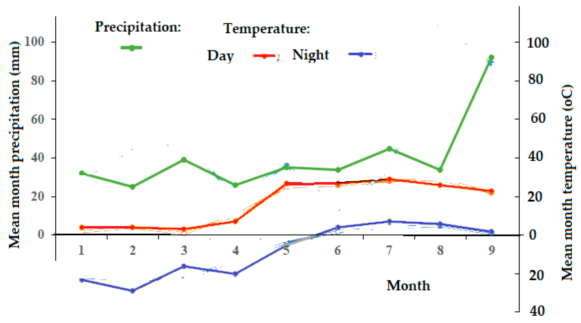 Mean annual temperature in the region studied reaches −0.5 °C due to the proximity of the Polar Circle and severe winters lasting about 6 months, bringing sudden cold snaps with temperatures dropping to −30 °C or even lower. Summer is short and cool, with mean temperatures from 10 to 15 °C. During the expedition in 2024, August was unusually dry and hot (Figure 2).