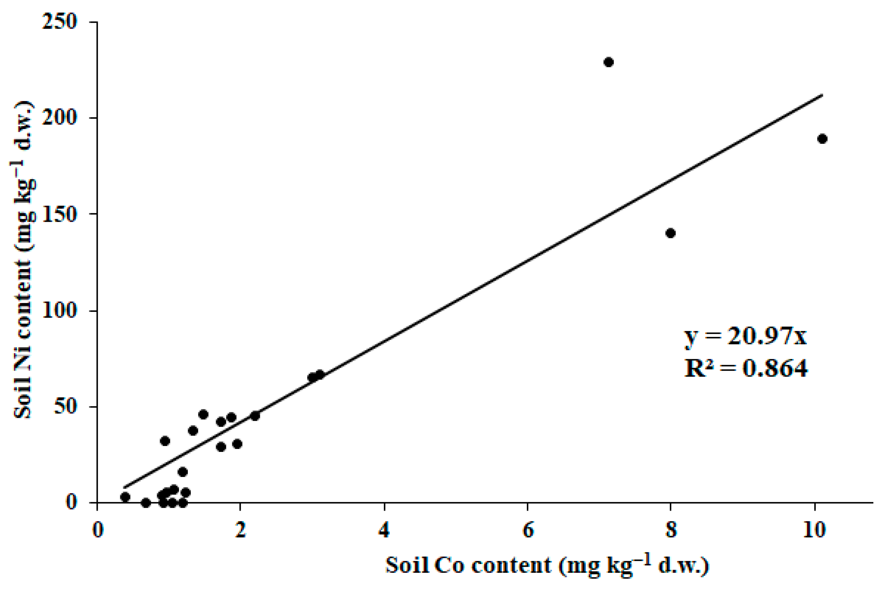 However, only upon ammonium acetate extraction were strong correlations revealed between soil Cu content and the distance from the smelting plant (Figure 5A), soil Ni and Co (Figure 6), and soil Cu and Se (Figure 5B) throughout the area investigated. The detected correlations were in accordance with the previously reported relationships between Ni and Co [50,51], and Cu and Se [12].