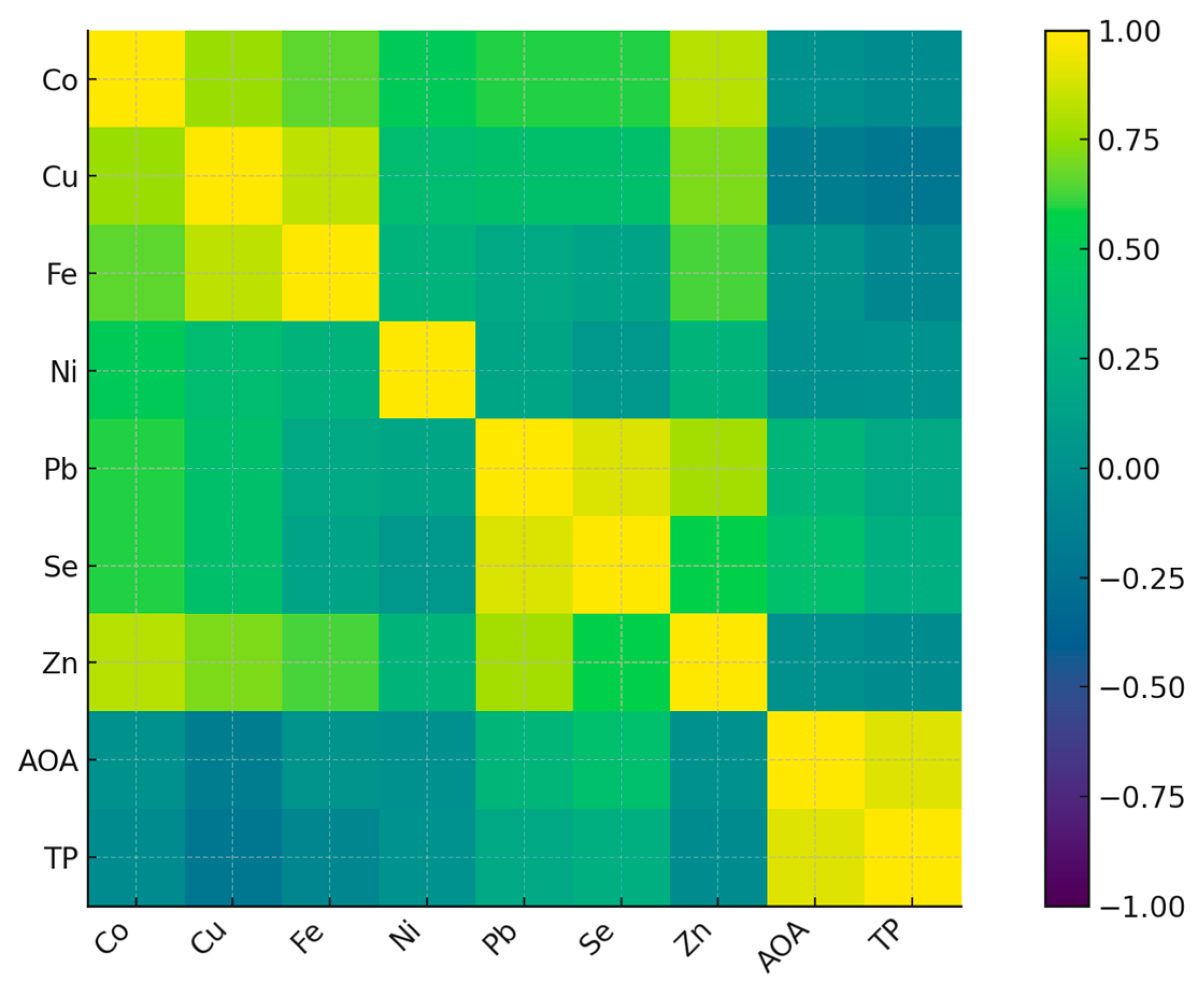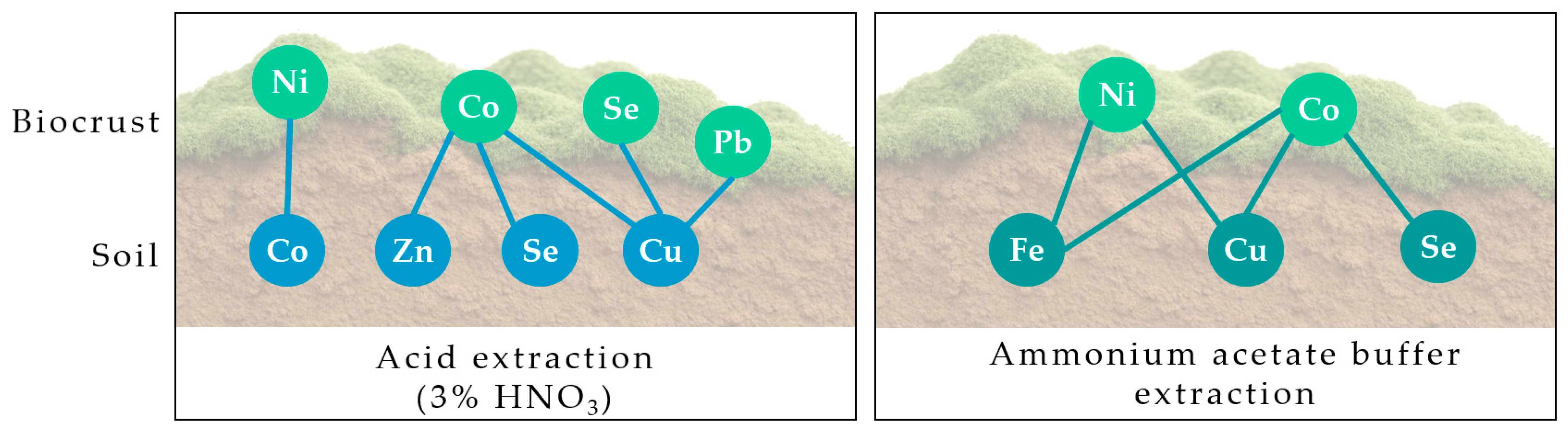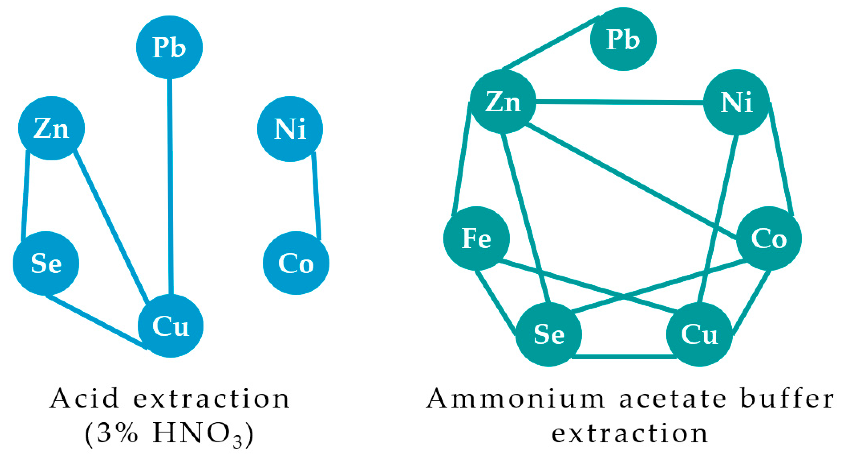 Furthermore, Ni–Co, Se–Zn, Se–Cu, and Zn–Cu exhibited significant correlations both in the case of nitric acid and ammonium acetate buffer utilization.