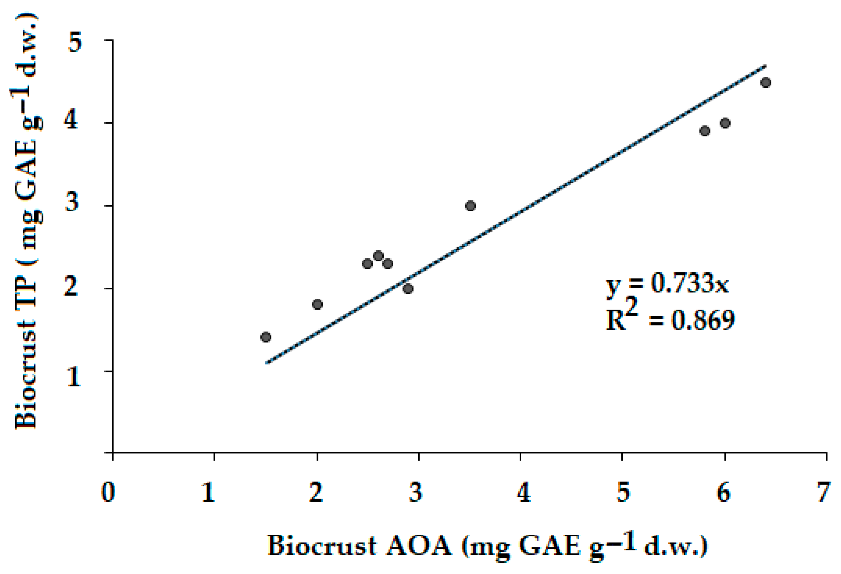 The total antioxidant activity of dried biocrust powder was assessed in ethanolic extracts after heating the samples in 70% ethanol at 80 °C for 1 h using a redox titration method developed previously for plant samples with gallic acid as an external standard [43]. A calibration curve was constructed using different concentrations of gallic acid (10 to 70 mg L−1); the recovery level was 98.5%, and the analysis was made in triplicate.