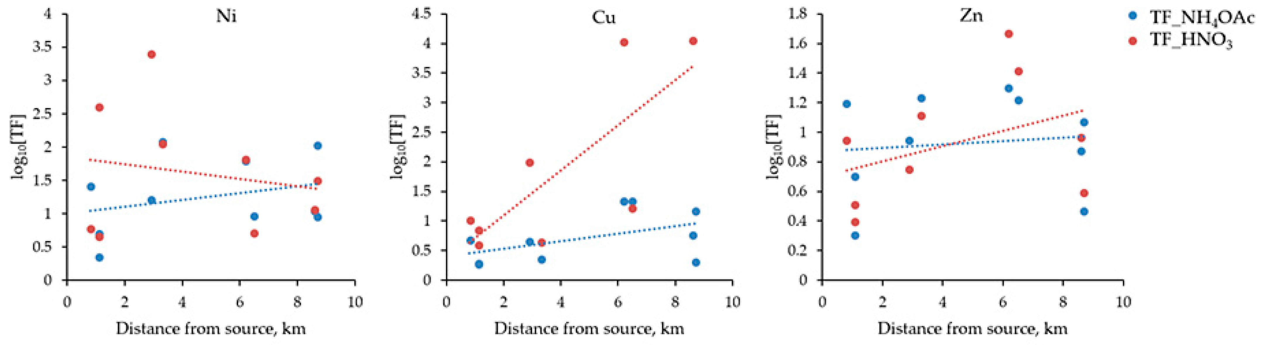 Unexpectedly, the rather chaotic distribution of soil elements extracted with diluted nitric acid in the N-W, S-W, and N-E directions from the smelting plant showed no correlations with the results of the buffer extraction (Supplementary Table S4). Furthermore, the obtained results did not confirm the literature reports about the ubiquitous higher extraction ability of 3% nitric acid compared to the buffer application [20]; the latter situation may relate to the peculiarities of Arctic conditions and specific interactions between elements in highly polluted areas.