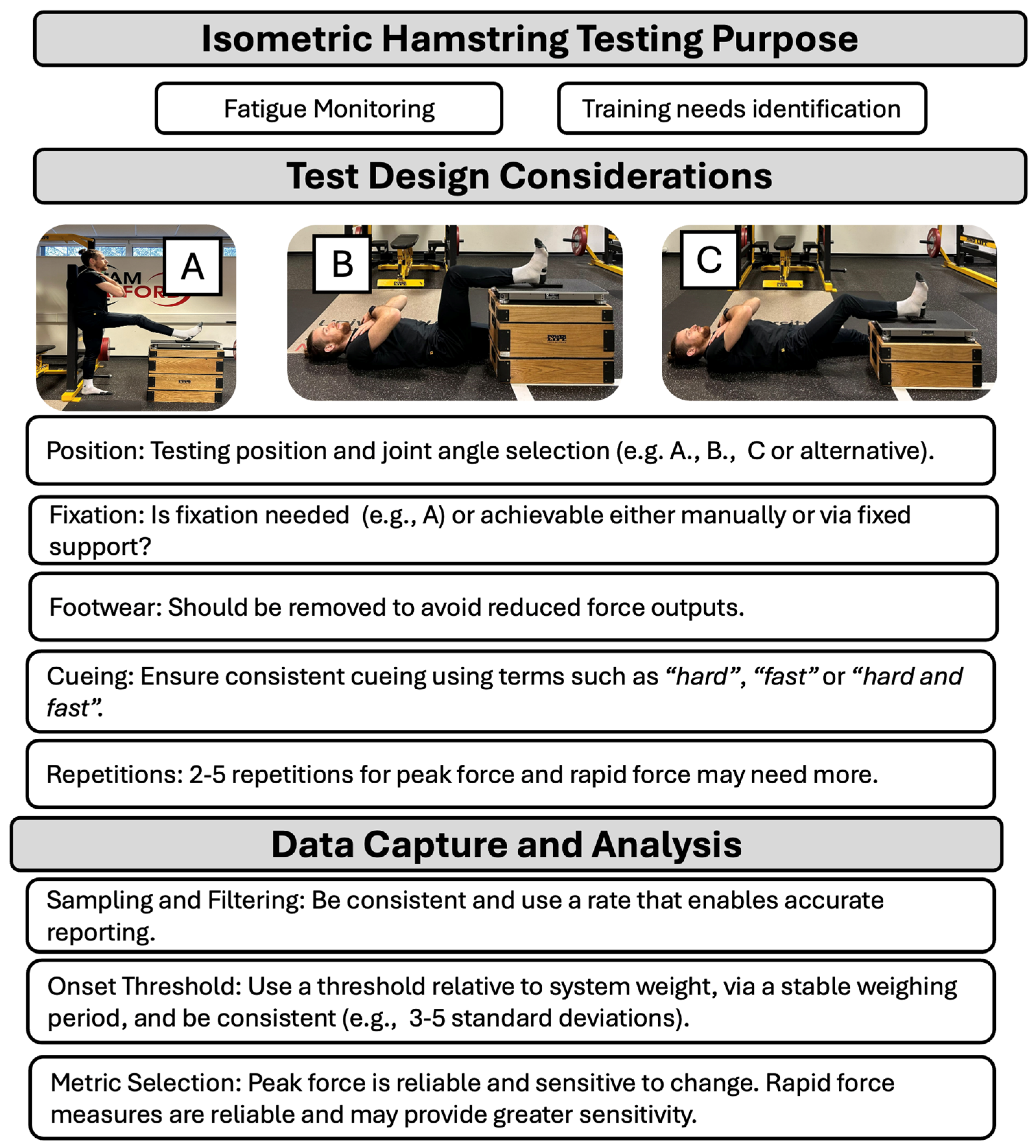 | Return to play or performance assessment criteria for lower limb injuries (e.g., hamstring or ACL) using isometric hamstring and plantar flexor assessments (i.e., phase progression thresholds). |