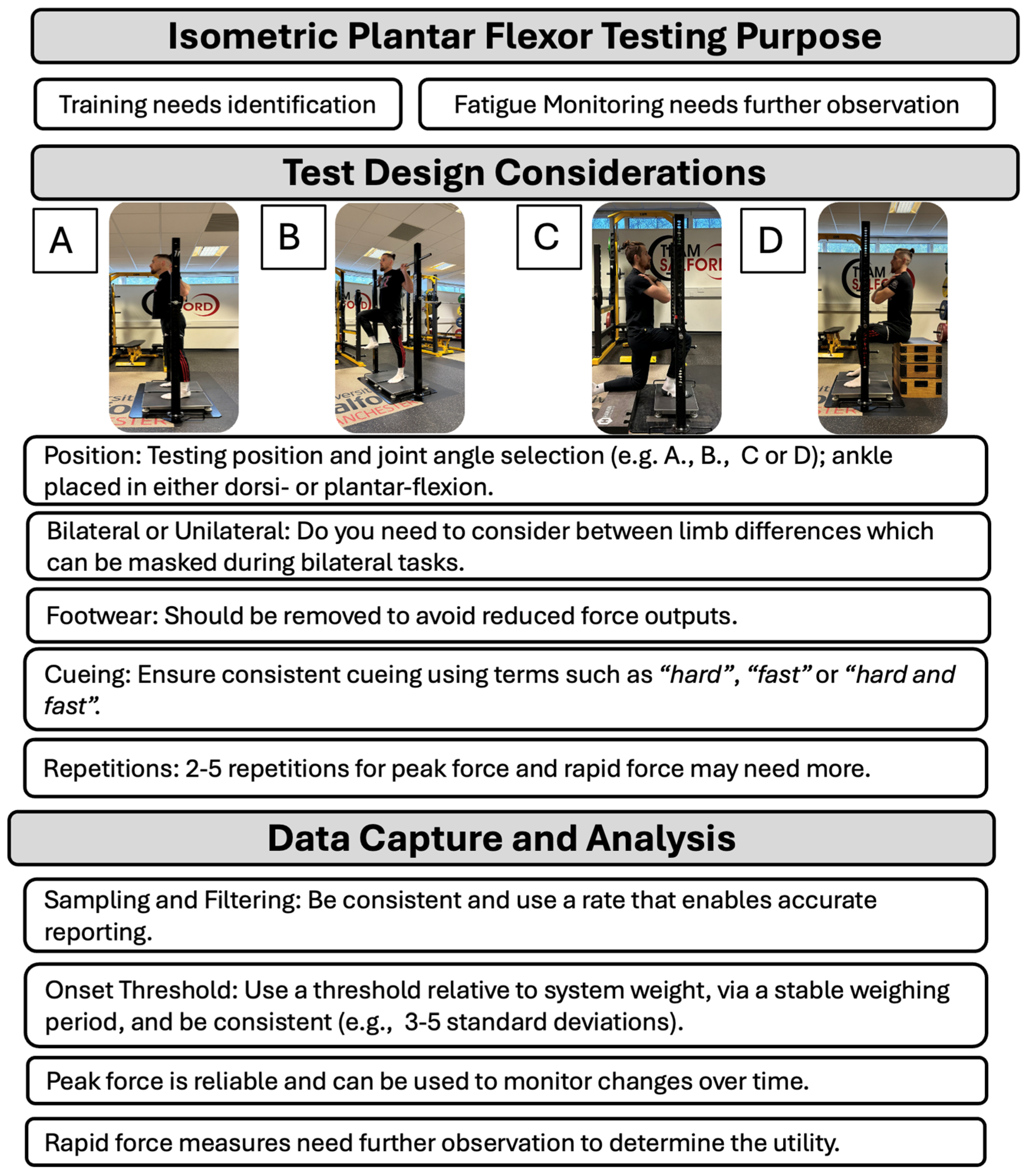 - McMahon, J.J.; Ripley, N.J.; Comfort, P.; Robles-Palazon, F.J.; Fahey, J.T.; Badby, A.J.; Bramah, C. The Kneeling Isometric Plantar Flexor Test: Preliminary Reliability and Feasibility in Professional Youth Football. J. Funct. Morphol. Kinesiol. 2023, 8, 164. [Google Scholar] [CrossRef] [PubMed]