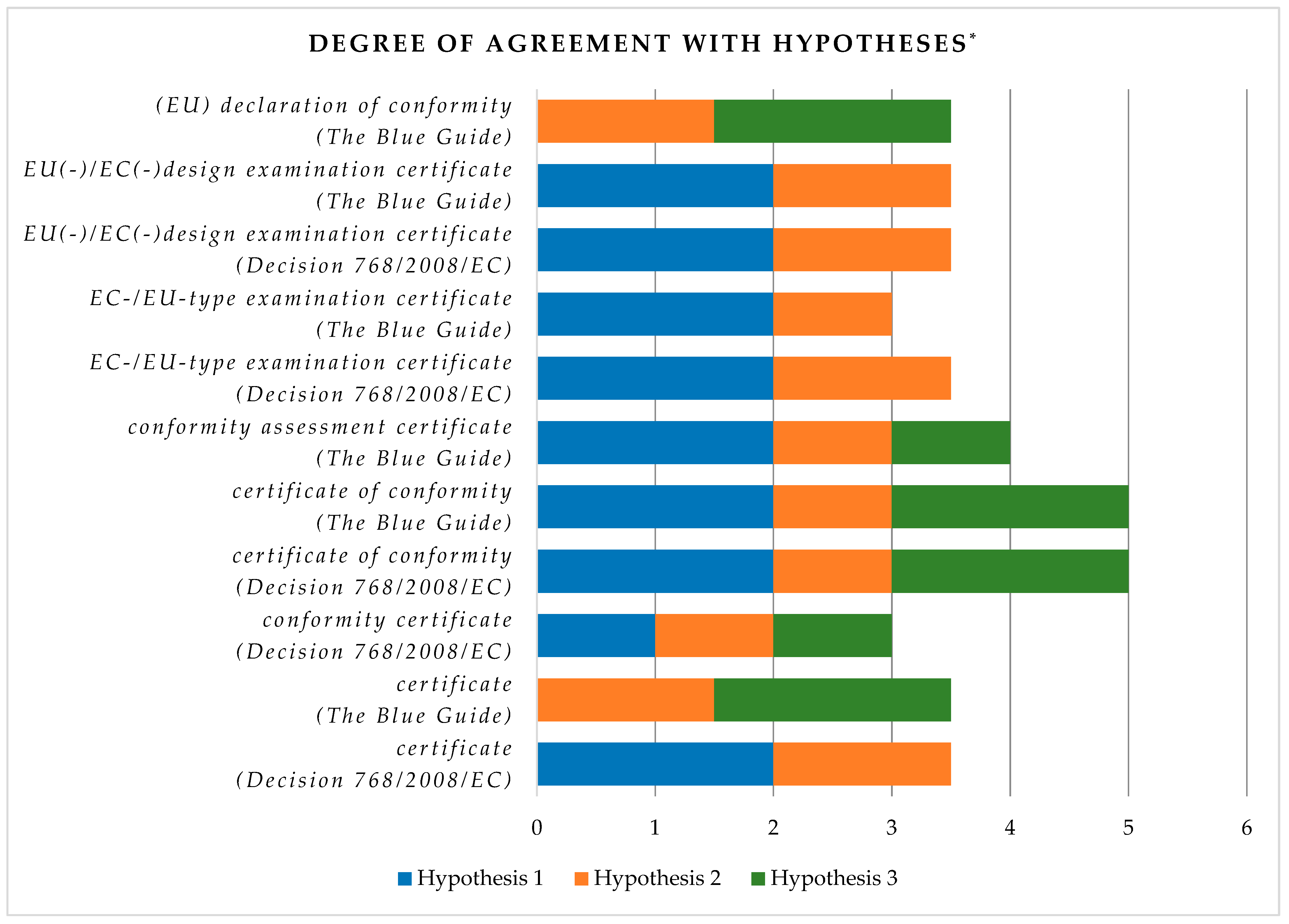 In summary, the semantic analysis has identified several sources of ambiguity that have a negative impact on understanding the meaning of the terms for the result document. The first is the lack of fixed definitions in both standards and legislative text sources. Definitions are the main source providing the meaning and are therefore indispensable, especially in communication between parties involved. Furthermore, given definitions are written without considering the rules of terminology work and are therefore difficult to interpret. The second reason is that existing text sources and their terms are not taken into account when writing new documents or updating the old version. This publication therefore aims to encourage standardization experts and legislators to improve term harmonization. As could be identified, high-priority terms to be defined are certificate, report (and its difference to all other result documents), (formal) certification documentation, and (formal) certification documents. Here, the development of harmonization guidelines for equivalent terms between the fields of legislation and standardization would be helpful.