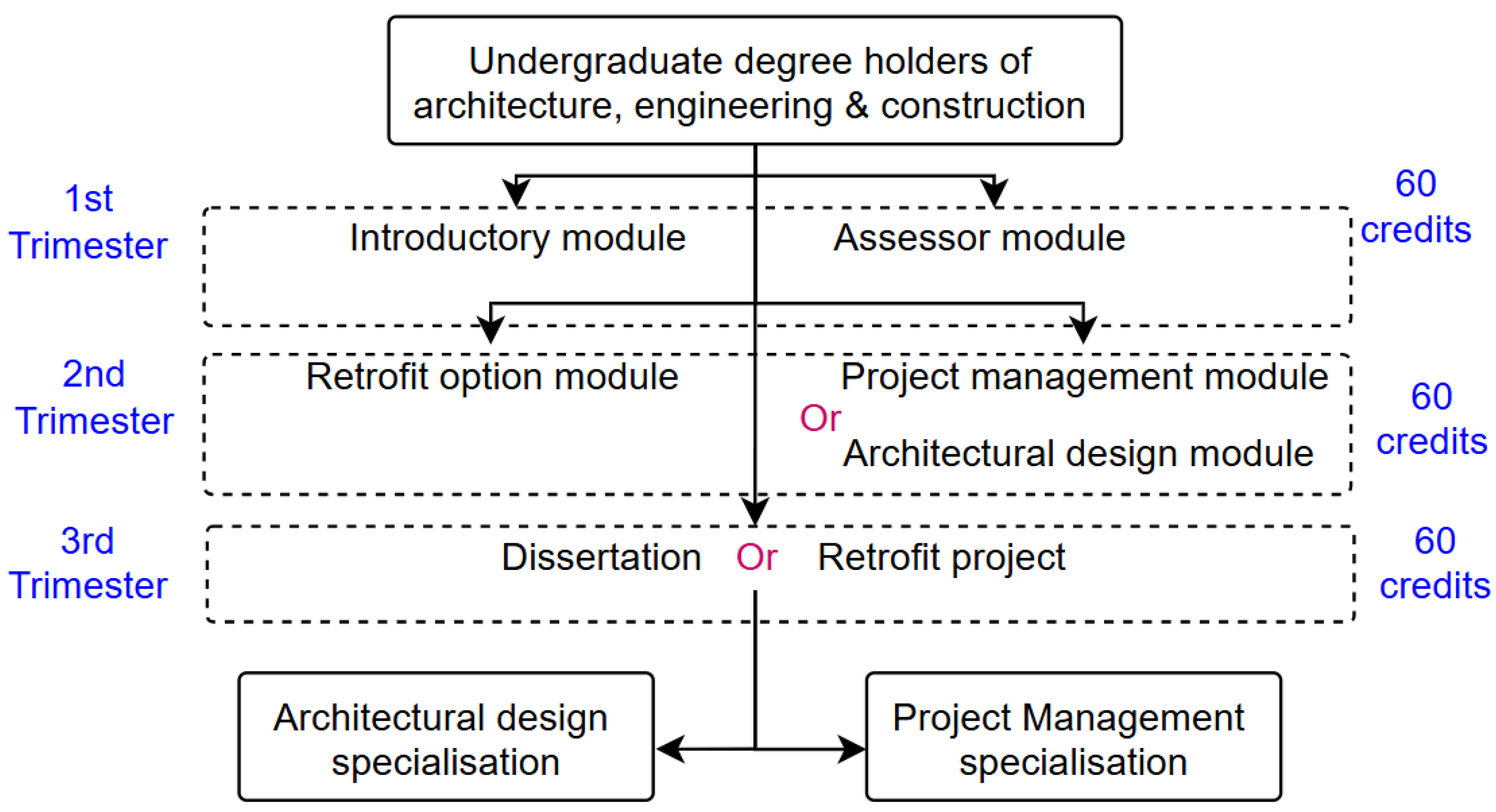 The students will first learn a module, in which they will be introduced to retrofit. The assessor module provides knowledge about the retrofit assessment, which will set the scene for understanding the concepts of retrofit. These will be the two modules for the first trimester, and they will be mandatory modules. The second trimester will have a mandatory retrofit option module. The next module will be decided according to the specialisation: project management or architectural design. The final trimester should have either a dissertation project or a retrofit project.