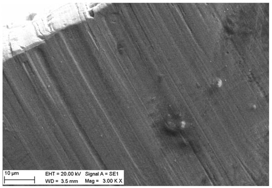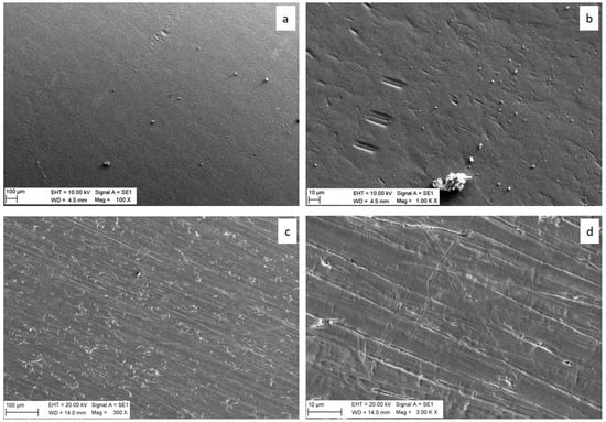 A surface analysis of the Pd77Ag23 and Pd30Ag70 samples was performed by means of a SEM/EDX technique to investigate the alloy composition and the absence of impurities and defects. Micrographs Figure 1a,b show the Pd77Ag23 sample, while Figure 1c,d refer to the Pd30Ag70 sample. The surface of the Pd77Ag23 sample is rather smooth and regular, with only few irregularities mainly due to the manufacture procedure (i.e., lamination); in the Pd30Ag70 sample, the effects of the lamination process are much more evident. For this reason, SEM analysis was also performed along the cross-section. As shown in Figure 2, SEM analysis revealed that the scratches due to the lamination involve only the surface of the sample and not the bulk of the materials, which appears rather regular and homogeneous.