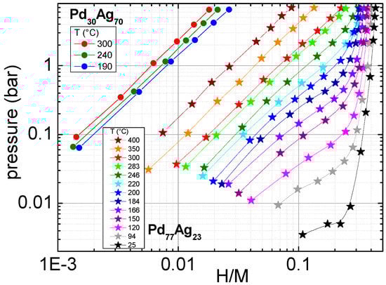 The solubility increases for both samples as temperature decreases. Moreover, at selected temperature and pressure conditions, the hydrogen concentration in Pd77Ag23 is at least one order of magnitude higher than in Pd30Ag70. In Figure 3, one can observe different shapes of the sorption curves as a function of the absorption temperature and Ag content. In fact, Pd30Ag70 shows at all the three temperatures (above 190 °C) a linear dependence of ln(p) from ln(c). This behavior is expected when a single phase is present in the sample. As the hydrogen concentration is extremely low (lower than 10−2), the phase should be the α one, i.e., the solid solution of hydrogen in the metal matrix. This fact is in agreement with previous investigation of the Pd–Ag–H phase diagram in which, for concentration higher than 30% of Ag, only the α phase seems to occur [24,25]. In the case of Pd77Ag23 the high temperature curves (T > 280 °C) clearly display a similar linear dependence, witnessing the occurrence of only the α phase. At lower temperatures, especially below 200 °C, two inflections centered around H/M ~0.08 and 0.25 are visible. This behavior suggests the occurrence of a solid solution at low concentrations and the gradual transformation from the α to the β hydride phase at higher concentrations. This findings are in close agreement with the existence of a critical temperature reported between 283 and 295 °C for Pd–H system [26]: above such a temperature only solid solution of H in palladium can be observed, while at lower temperatures, a transition toward the hydride phase has been reported.