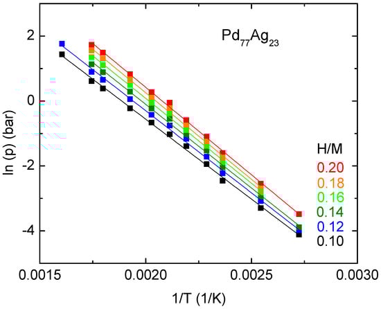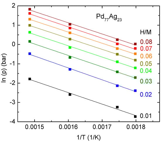 Figure 4 and Figure 5 display the van’t Hoff plot of Pd77Ag23 in the two different zones of the pressure–composition graph: low c and high T (i.e., in the α phase), higher c, low T (i.e., in the coexistence region of the α and the β phase).