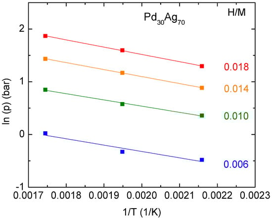 The van’t Hoff plot for Pd30Ag70 is reported in Figure 6. The best fit provides a value of ΔHhyd of ~10.8 ± 0.6 kJ/mol, a value much lower than in the case of Pd77Ag23. Indeed, previous investigation of the Pd100−xAgxH system by calorimetric measurements indicated that the absolute value of the hydrogenation enthalpy has a maximum value for x of ~40 and decreases on the further increase of the silver content in the alloys up to an x value of ~50. No additional information about the hydrogenation enthalpy of the Pd100−xAgxH system are available for higher x values [27].