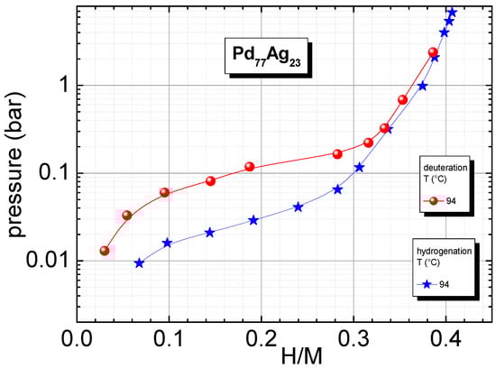 Finally, we investigated the isotopic effect between hydrogenation and deuteration for Pd77Ag23 at 94 °C, as no information is available for such a content of Ag in the Pd–Ag membranes. Due to the limitations of our inlet line for deuterium, we extended our measurements only up to 2 bar, so we chose a low temperature in order to study the whole absorption curve. The two absorption isotherms measured for hydrogenation and deuteration are reported in Figure 7. Above a c value of ~0.3 H/M, the two curves coincide, while for lower hydrogen concentrations, the D absorption curves is displaced towards higher pressures by almost one order of magnitude. It is well known, indeed, that palladium has an unusual isotopic effect: in normal compounds, the curves corresponding to deuteration are displaced toward lower pressure, while in the case of palladium, the opposite effect occurs. Similar behavior, with a higher pressure plateau for deuterated samples, has already been reported by Anand et al. for Pd75Ag25 [28] and by Hara et al. for Pd93Ag7 [31].