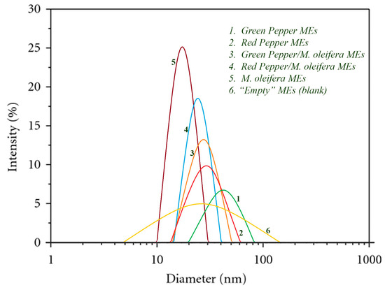 The particle size distribution is considered as the most important characteristic for the assessment of the nature and stability of the emulsions. The results (Figure 3) of the particle size of the prepared MEs showed that their average value varied between 10 and 95 nm. The mixture (50/50 w/w) of samples of Green or Red Pepper extracts with the extract from the leaves of Moringa oleifera L. tree showed that the distribution of values of the particle size has a narrower base (with a small variation of the sizes of these particles around the average value). M. oleifera MEs showed the narrowest base and the highest intensity among all samples tested, while Green Pepper MEs showed the widest base and the lowest intensity. It is concluded that all the prepared MEs have a highly uniform particle size (small size dispersion around the average value). Additionally, the absence of aggregates and stability of these structures was concluded. Finally, the distribution results showed that “empty” MEs (blank) exhibit a range around average value, which was larger compared to those MEs that incorporate extracts.