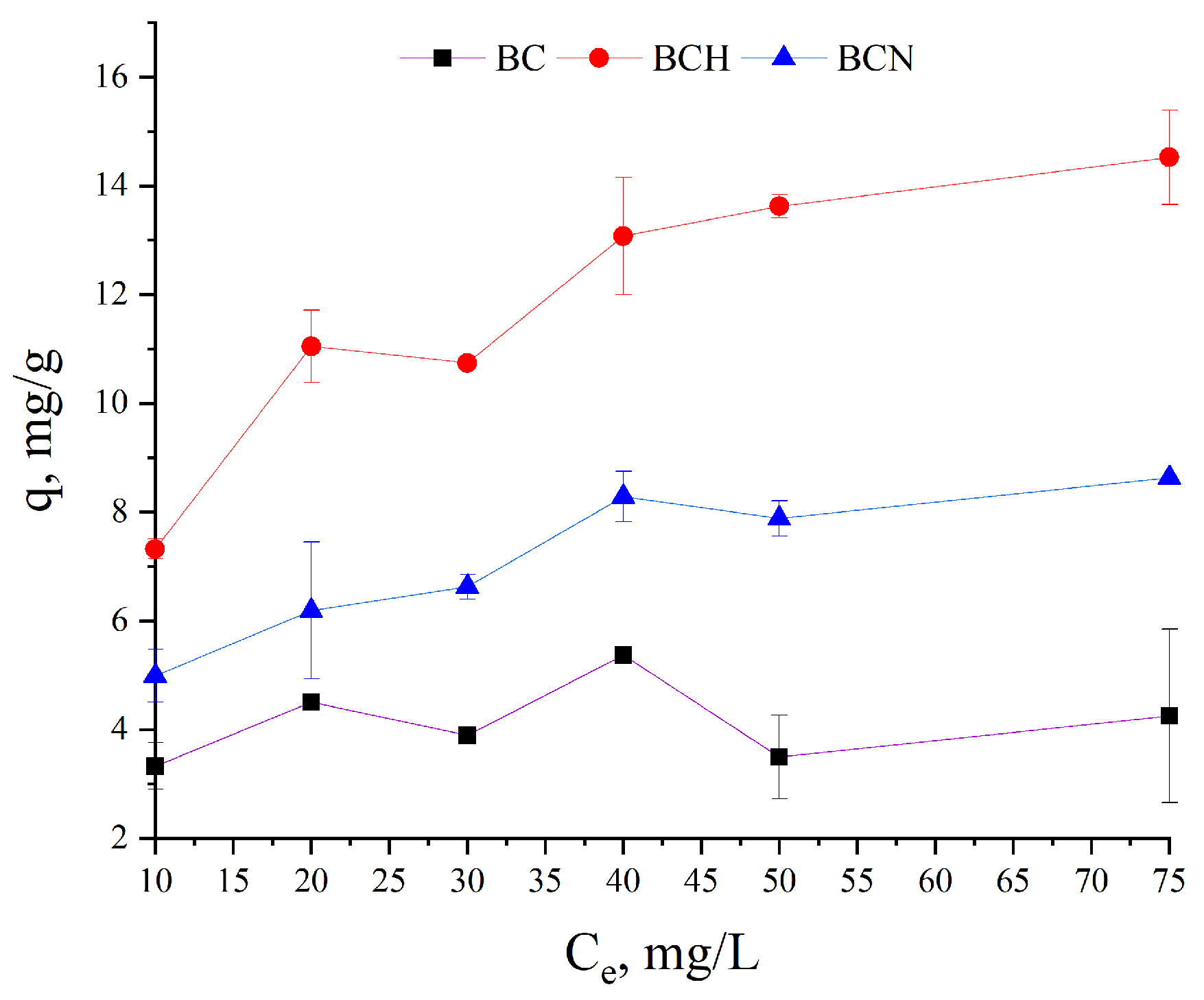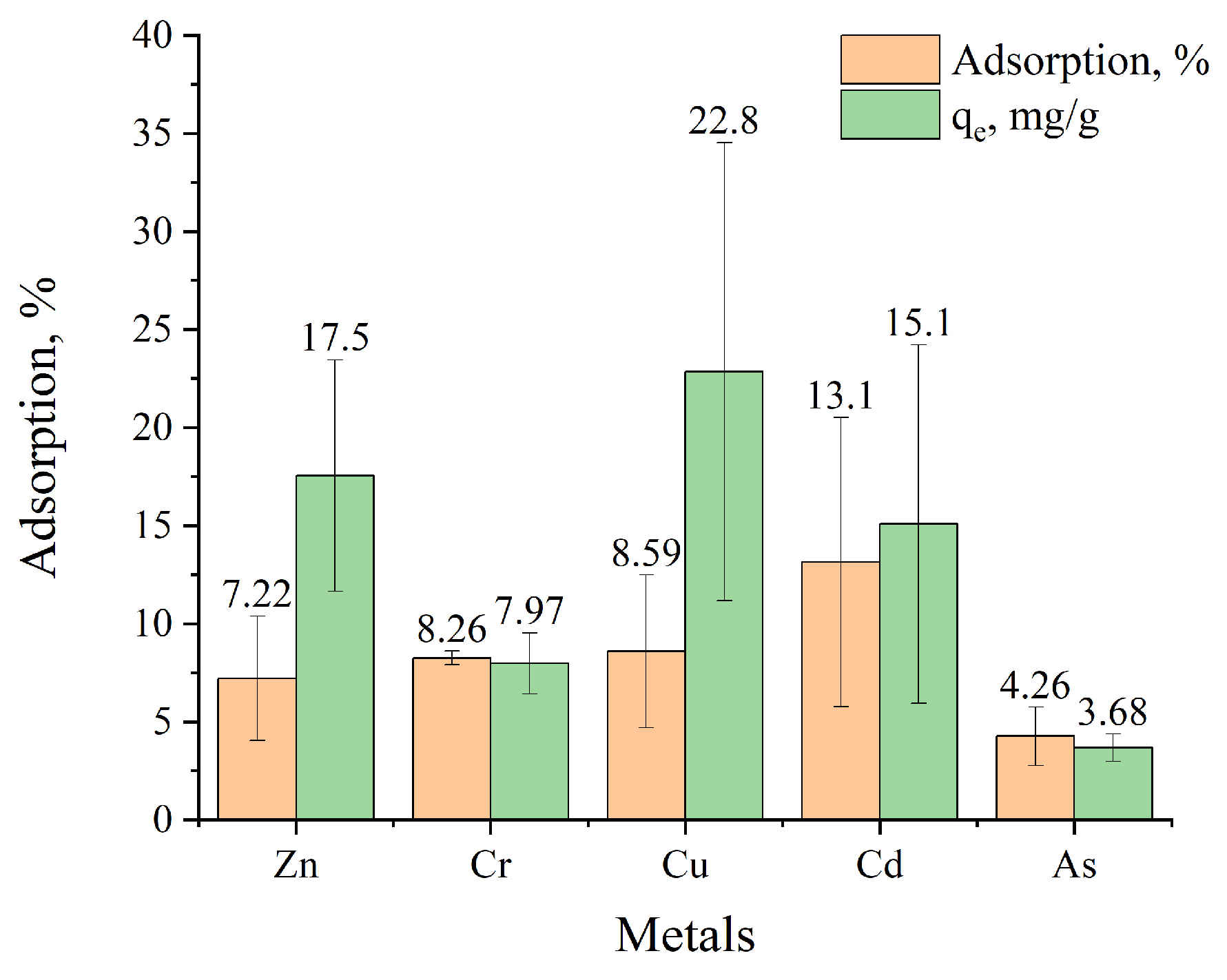 - Komkiene, J.; Baltrenaite, E. Biochar as Adsorbent for Removal of Heavy Metal Ions [Cadmium(II), Copper(II), Lead(II), Zinc(II)] from Aqueous Phase. Int. J. Environ. Sci. Technol. 2016, 13, 471–482. [Google Scholar] [CrossRef]