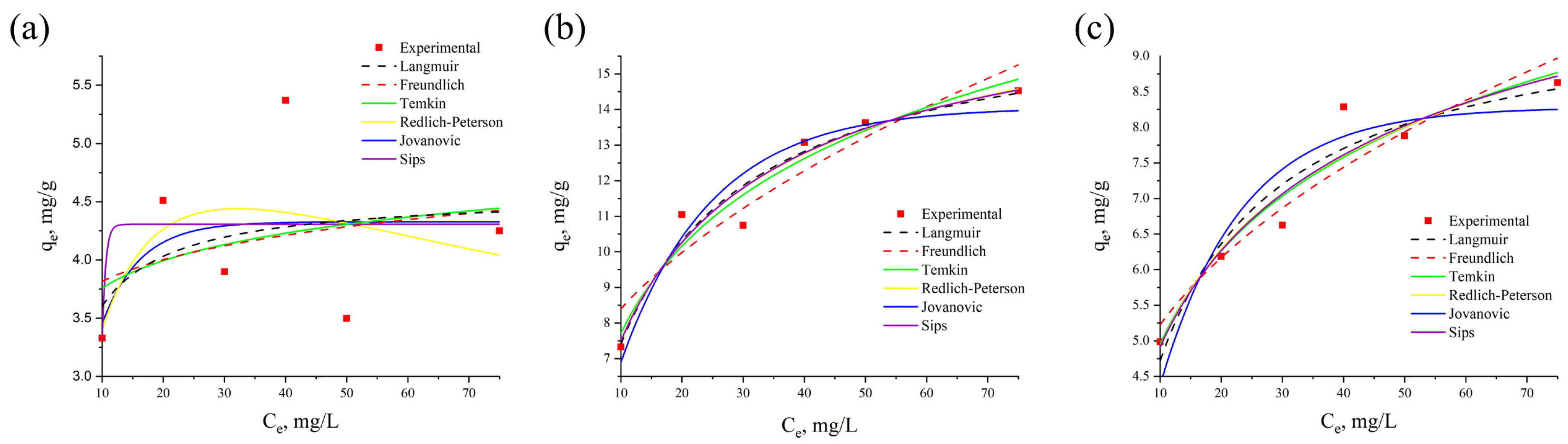 | Freundlich | KF [(mg/g)(L/mg)1/n] | 2.3332 | 4.9278 | 2.5228 | |